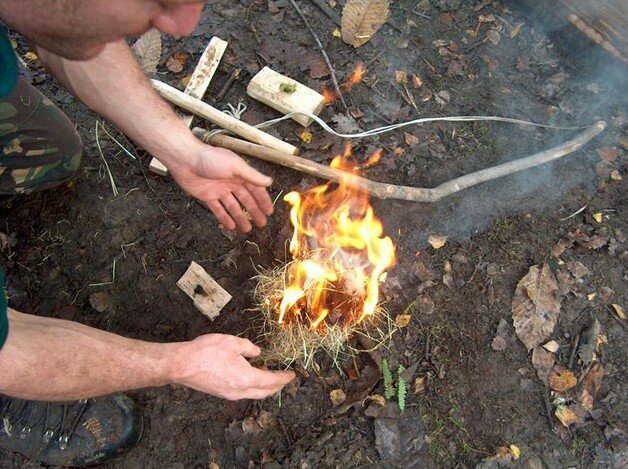 Proses pertama, kedua, dan ketiga sama persis dengan teknik hand drill maupun fire plough. Anda harus menyiapkan sebuah ranting kayu kering untuk poros, sebuah papan kayu untuk alas, serta sebuah kayu sebagai pemegang poros. Jangan lupa juga sekumpulan rumput atau daun kering dan selembar daun untuk mengumpulkan serbuk kayu yang terbakar.